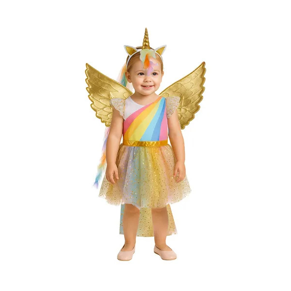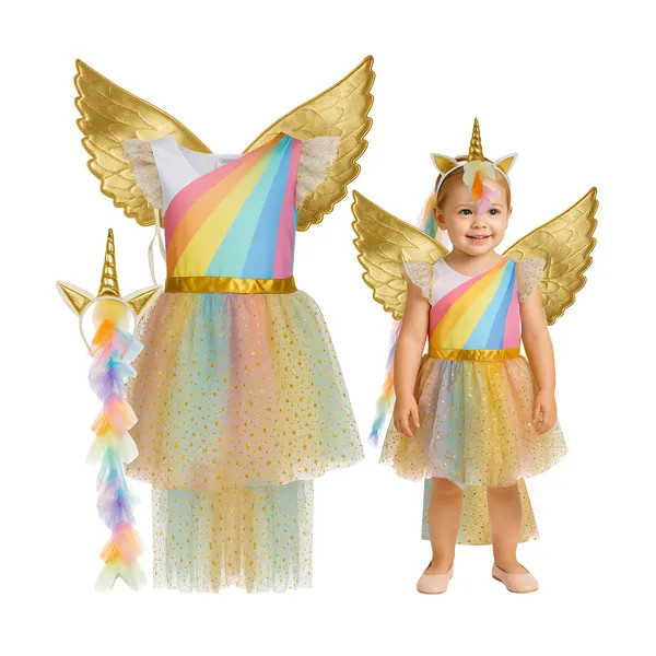 - Teljes szett: ruha (86×34 cm), levehető aranyszárnyak rugalmas pánttal, unikornis fejpánt.