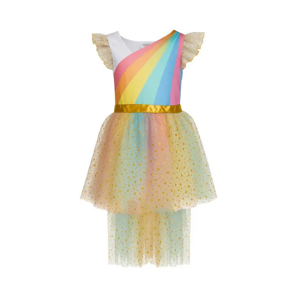 Varázsolj mosolyt gyermeked arcára ezzel a 3 részes unikornis jelmez szettel! A csillogó tüllszoknyás ruha, az aranyszínű szárnyak és a szarvval, fülekkel díszített fejpánt azonnal mesebeli hercegnővé változtatják a 4–6 éves kislányt. A könnyű, puha anyagoknak köszönhetően egész nap kényelmes viselet, a praktikus belebújós fazon pedig öltözködéskor időt spórol.