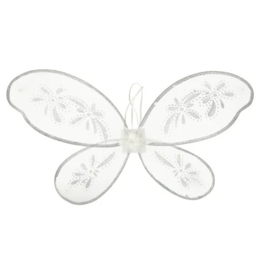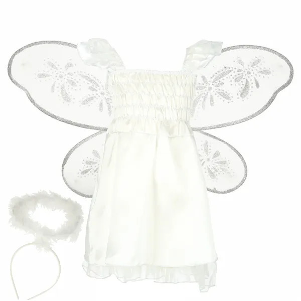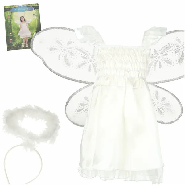 - Háromrészes szett: fehér ruha, csillámos szárnyak, aureolás fejpánt