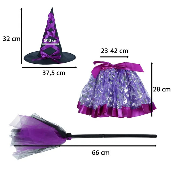 - A szett tartalma: tüllszoknya gumis derékkal, hegyes kalap és 66 cm-es seprű.