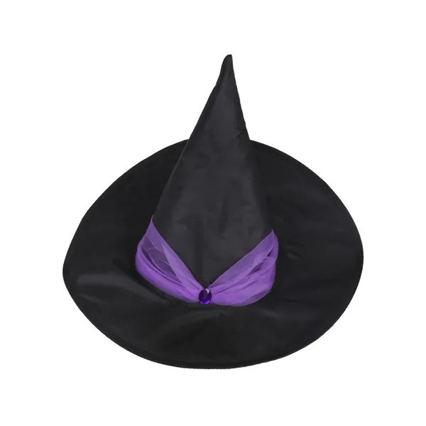 - Fekete, hegyes boszorkánykalap lila tülldísszel és apró „gyémánttal”