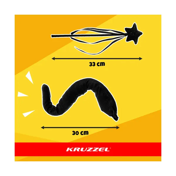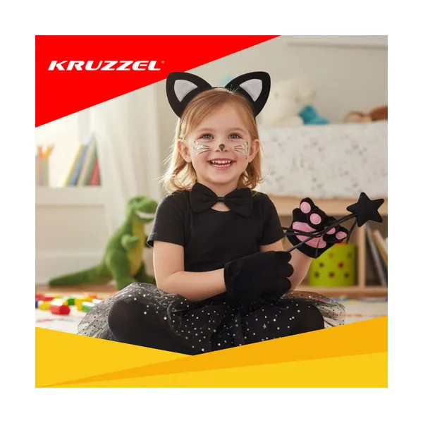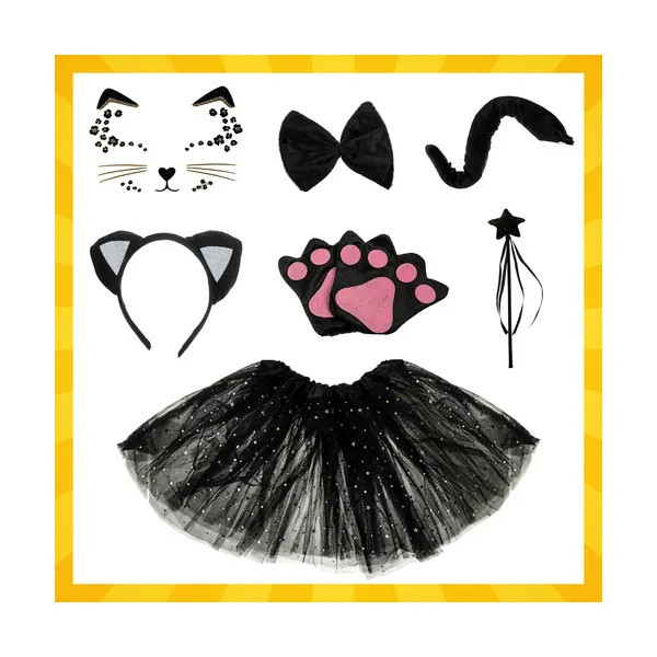 - Teljes szett: tüllszoknya, füles fejpánt, varázspálca, mancsok, farok, csokornyakkendő és öntapadó arcmatricák a tökéletes macskás megjelenéshez.