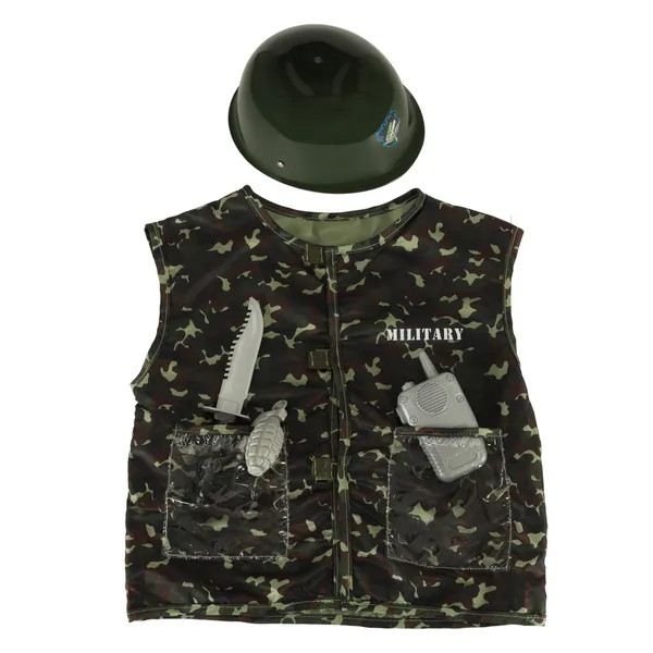 - Tartalom: terepmintás mellény, műanyag sisak, játék kés, gránát és rádió