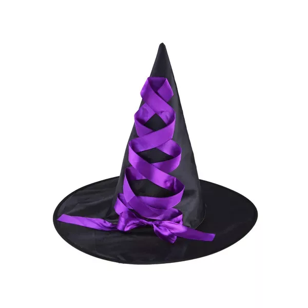 - Fekete hegyes kalap lila szatén szalaggal – perem átm.: 36 cm, magasság: 34 cm, fejkerület: 54–56 cm