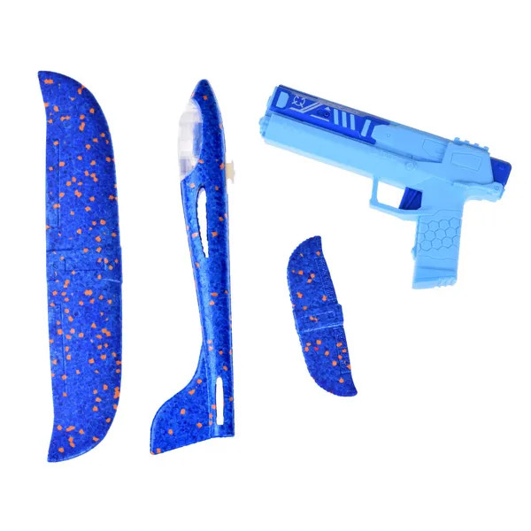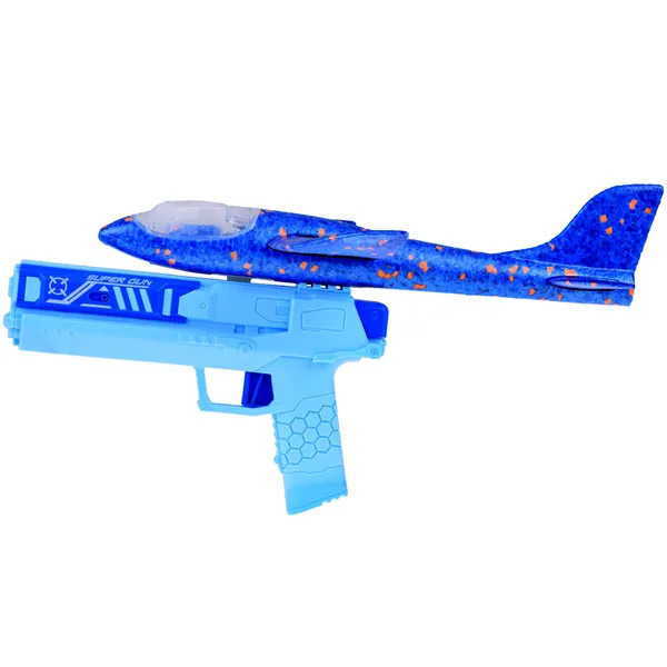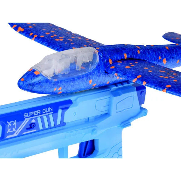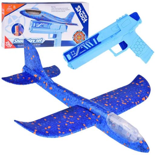 A LED-del szerelt hab repülőhöz tartozó kilövő pisztollyal egy mozdulattal indíthatod útjára a 31 cm-es, kék gépet. A beépített fények sötétben is látványossá teszik a repülést, így a játék nem ér véget napnyugtakor sem.