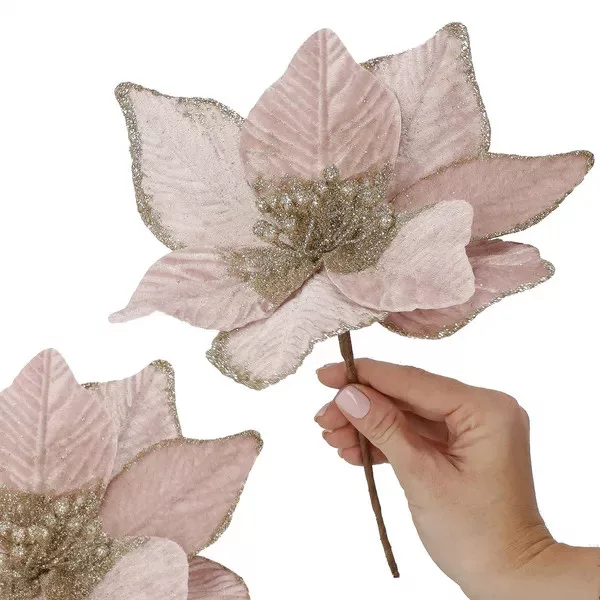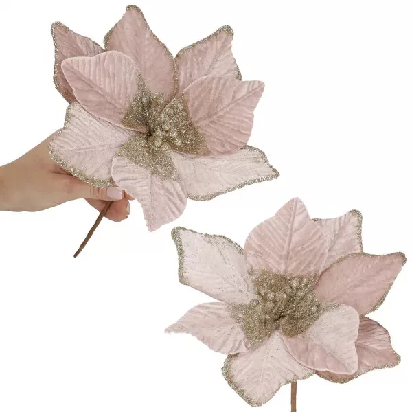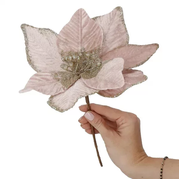 A rózsaszín, arany csillámporos mikulásvirág 25 cm-es átmérővel ragyogó fókuszponttá teszi a fát, koszorút vagy asztaldíszt, ráadásul tartós műanyagból készült, így évekig újrahasználható. Hajlékony drótos szára gyors, stabil rögzítést tesz lehetővé bármilyen dekorációban, akár otthonodban, akár üzleti kirakatban is látványos hatással bír.