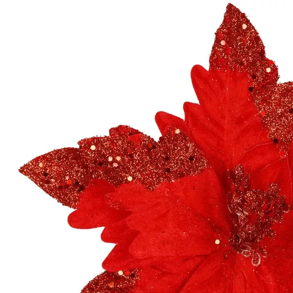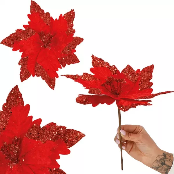 A csillámos piros mikulásvirág az ünnepi dekoráció klasszikusa, amely egyetlen mozdulattal meleg, karácsonyi hangulatot varázsol otthonába.