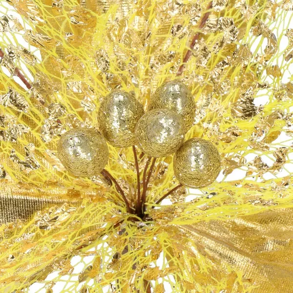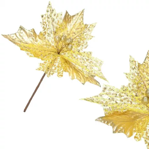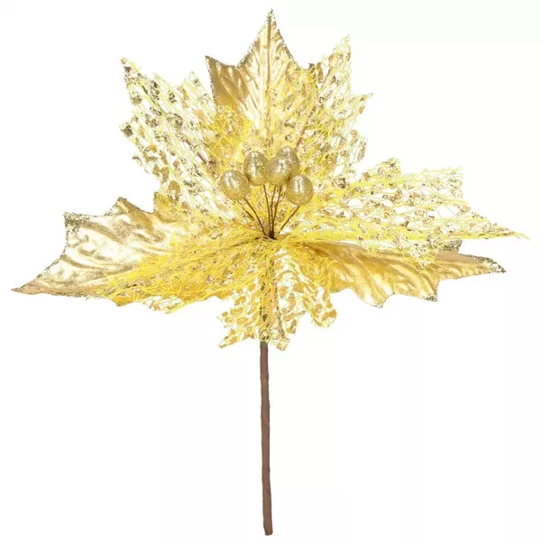Az arany–fehér mikulásvirág dísz egy elegáns, 24 cm átmérőjű, poliészterből készült karácsonyi dekoráció, amelyet könnyedén felhelyezhetsz a fenyőfára, koszorúra vagy ünnepi asztali kompozícióba. A formázható szár és a részletgazdag, csillámos szirmok extra ragyogást visznek az otthonodba.