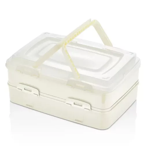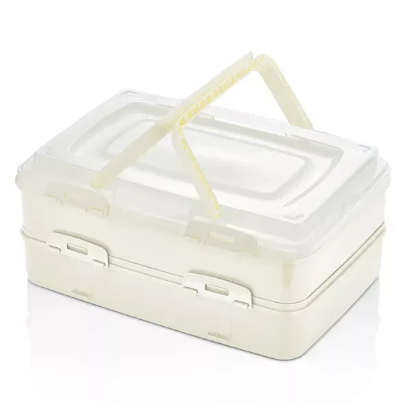 Vidd magaddal kedvenc tortáidat és pitéidet anélkül, hogy aggódnod kellene a krémek elcsúszása vagy a morzsák szétszóródása miatt! Az elefántcsont színű, 42×29×18 cm-es süteményszállító doboz egyszerre két 40×28 cm-es tortát vagy több adag péksüteményt fogad be, miközben erős zárszerkezete megakadályozza a kiborulást.
