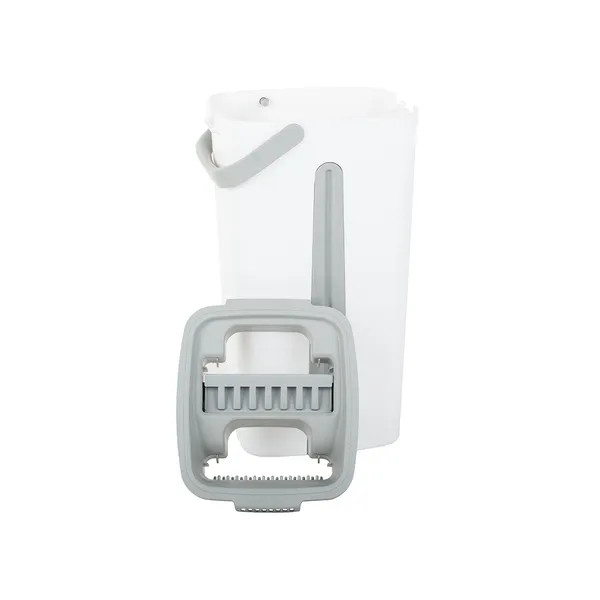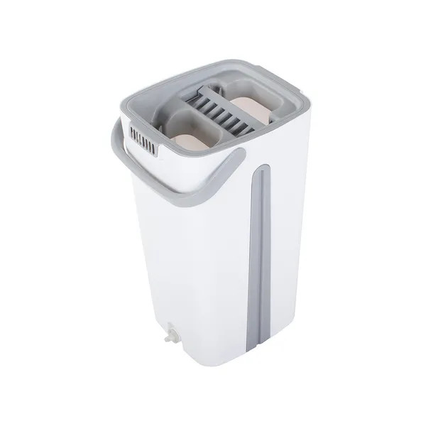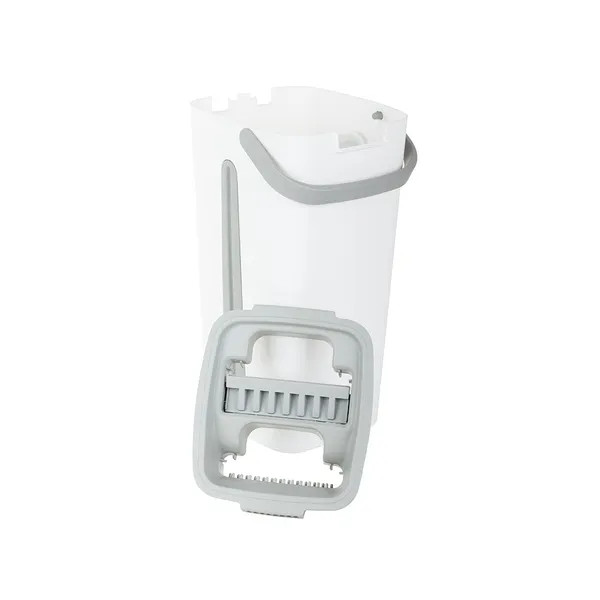 A vödör egyik kamrája a tiszta, a másik a piszkos vizet gyűjti, így minden húzás higiénikus marad. A beépített prés könnyedén kicsavarja a mikroszálas betétet – térdelés és kézáztatás nélkül.