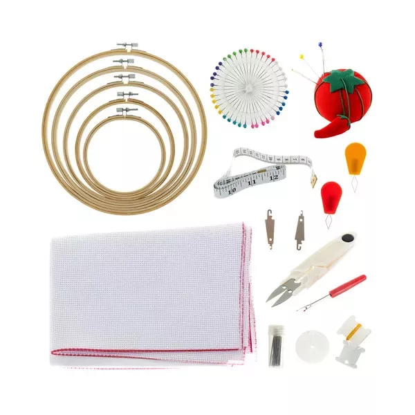 A csomag tartalma: 100 db hímzőfonal (8 m/szál), 5 db bambuszkeret (Ø 11,3–25,6 cm), 3 db hímzővászon, 10 db cérnacséve, aranyszemű tűk, befűzők, ujjvédő, varróolló, szabócenti, bontókés, viasz, 2 db vízben oldódó papír, tollbetétek és dekoratív kartondoboz.