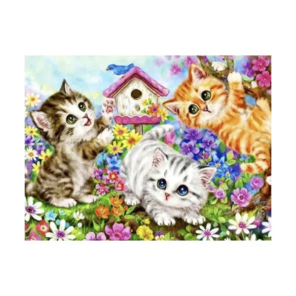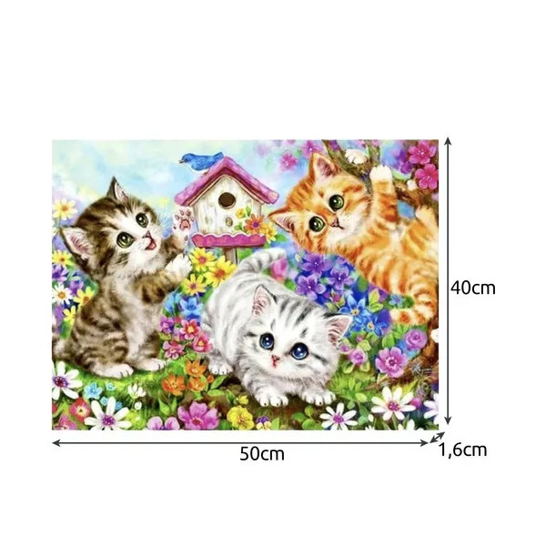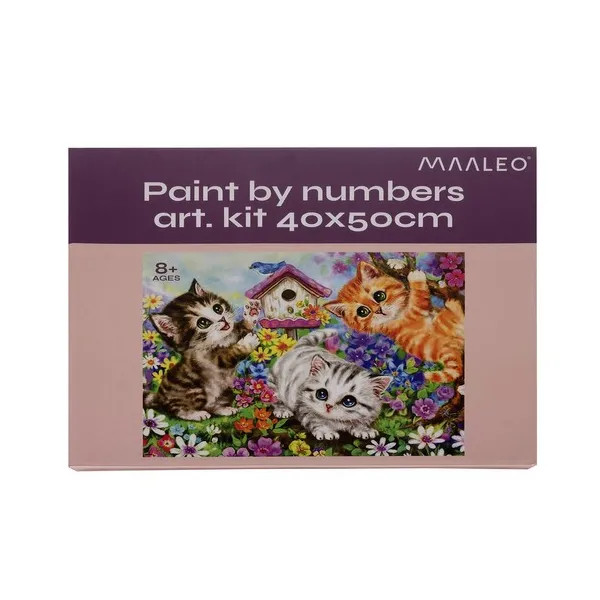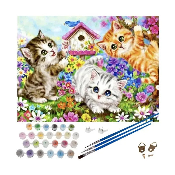 Fedezd fel a festés örömét ezzel a számfestő készlettel, amelynek középpontjában játékos macskák állnak.