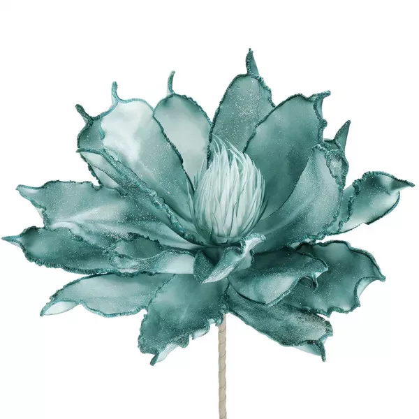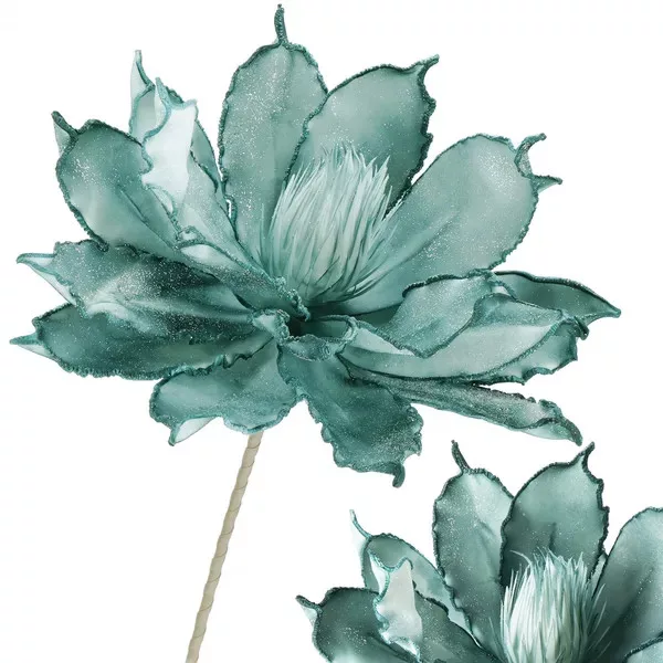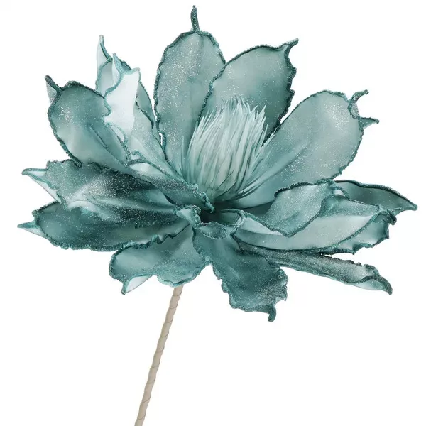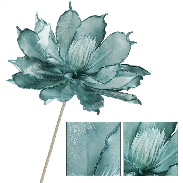 Hozd el a tenger frissességét és az ünnepi ragyogást otthonodba ezzel a turkiz-ezüst, csillámos művirággal, amely elegáns fókuszpontként díszítheti asztalodat, vitrinjeidet vagy rendezvényed helyszínét.