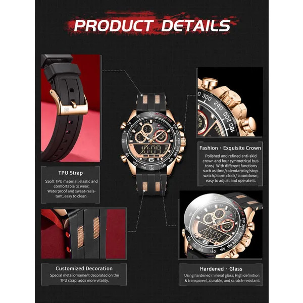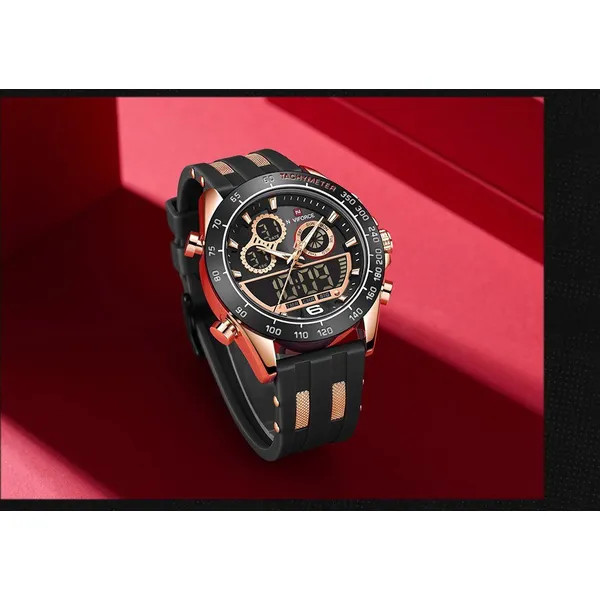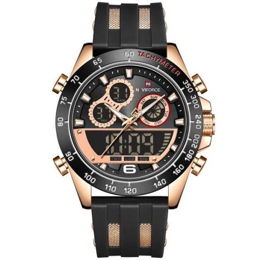 Sportos férfi karóra precíz Seiko kvarc szerkezettel, stopperrel, visszaszámlálóval, ébresztővel, dupla időzónával és háttérvilágítással, amely 3 ATM vízállósága révén megbízható társ a munkában, szabadidőben és edzés közben is. Puha, bőrbarát szilikon szíja, ásványi üvege és karakteres fekete-rosegold tokja tartós kényelmet, valamint határozott, stílusos megjelenést biztosít minden alkalomra.