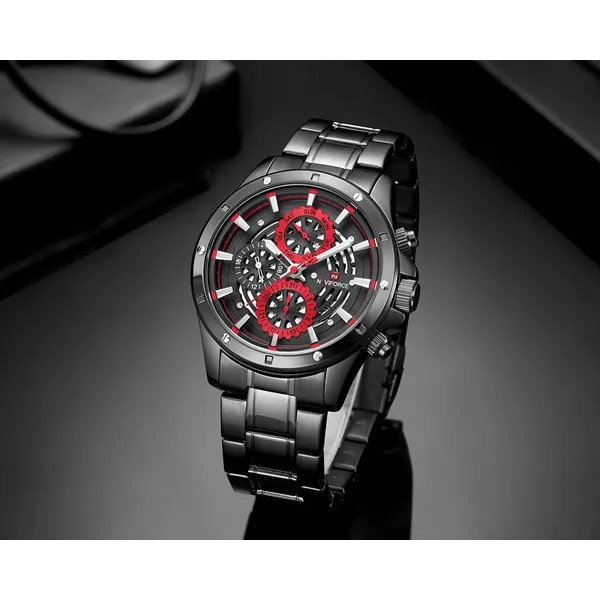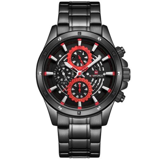 Elegáns, sportos megjelenésű Naviforce férfi karóra, amely a megbízható Seiko kvarc szerkezetnek köszönhetően pontos időmérést biztosít. A matt fekete IPB bevonatú tok és a rozsdamentes acél karkötő tartós védelmet nyújt, míg a piros részletek karakteres kontrasztot adnak.