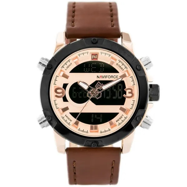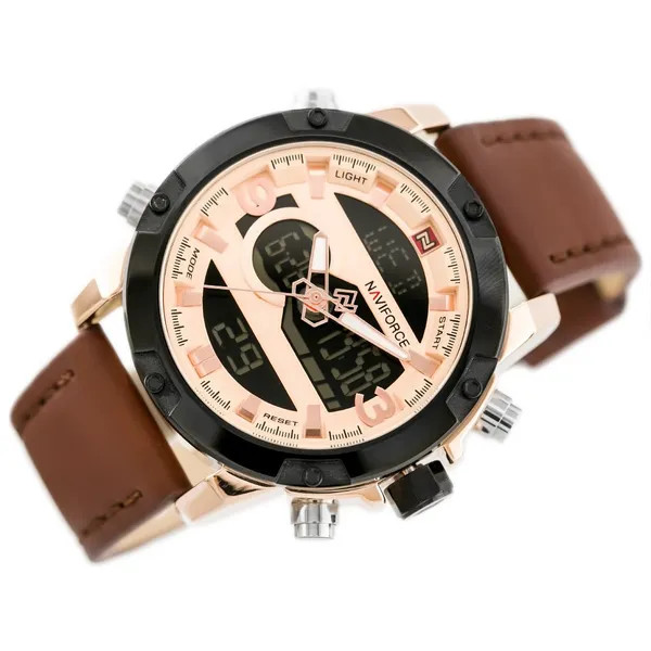A Naviforce NF9097 férfi karóra ideális választás azoknak, akik a sportos funkcionalitást elegáns megjelenéssel párosítanák. A megbízható Seiko AL21E4 kvarc szerkezet analóg-digitális kijelzéssel, a strapabíró rozéarany IP bevonatú tokkal és a kényelmes barna valódi bőr szíjjal együtt különleges összhatást kínál.