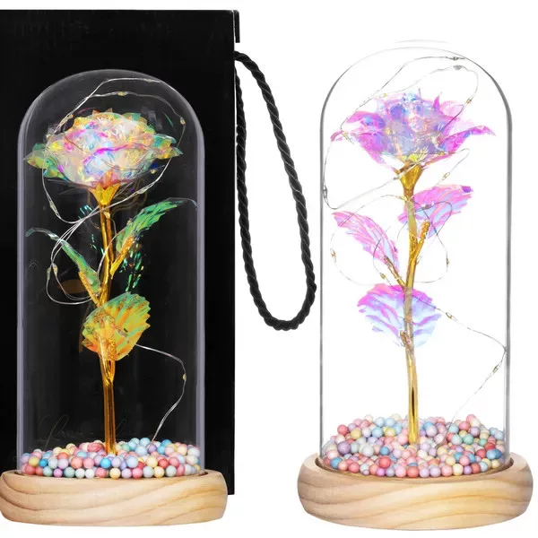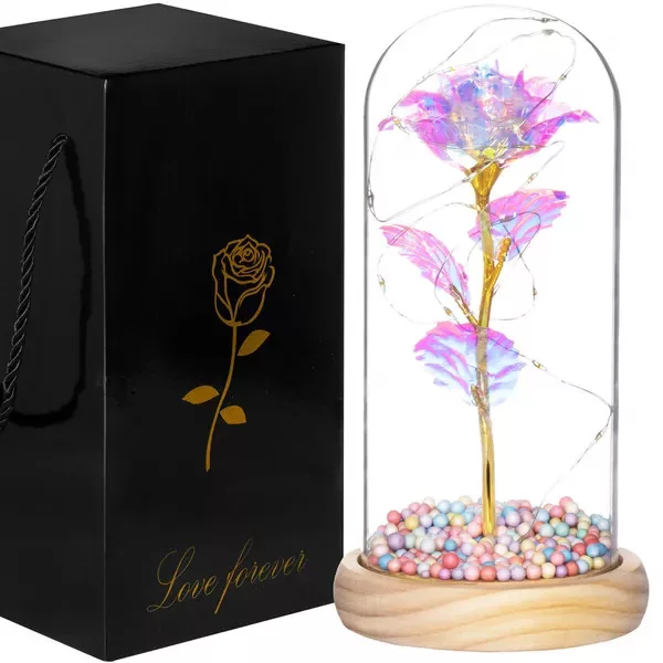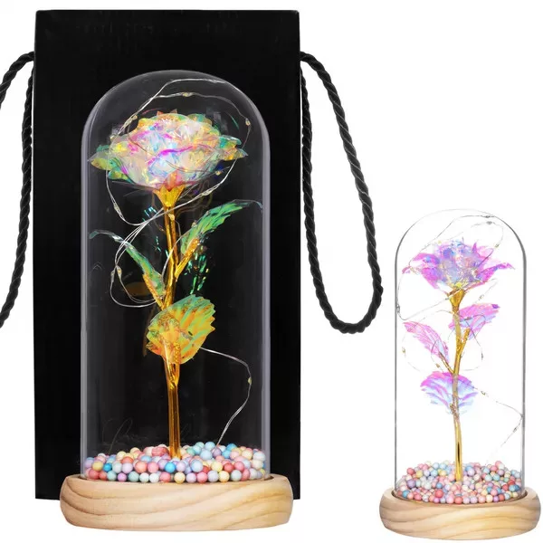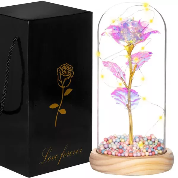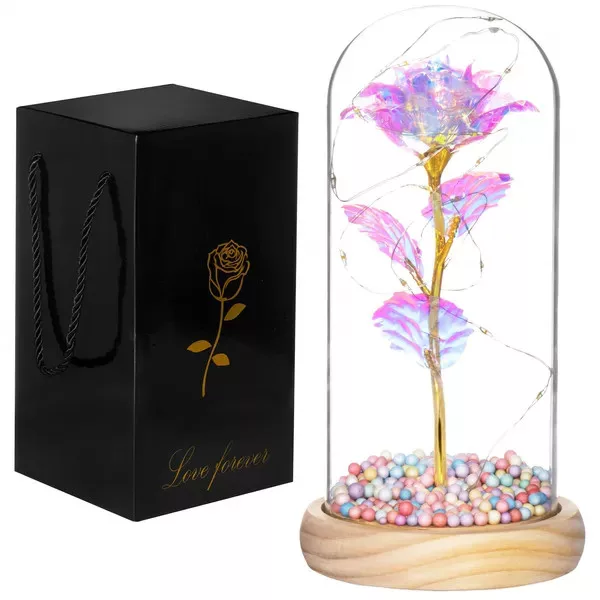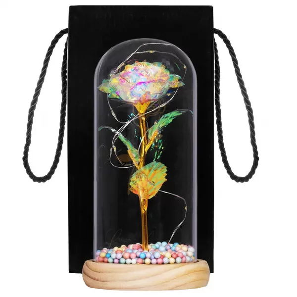 Az örök rózsa a romantika és a modern design tökéletes elegye: a multikolor, holografikus fényű virág aranyszáron, fa talpba rögzített üveg búra alatt ragyog. A melegfehér LED fényfüzér varázslatos hangulatvilágítást teremt hálószobában, nappaliban vagy ünnepi asztalon.