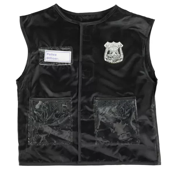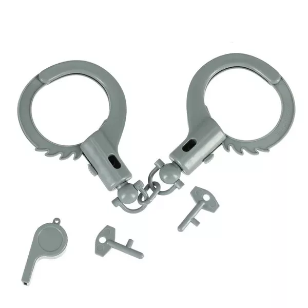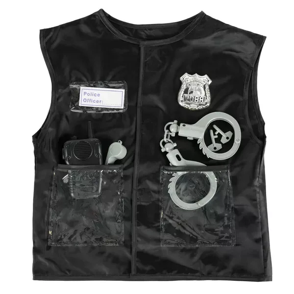 - Teljes felszerelés: rendőri mellény, bilincs kulccsal, síp és játék walkie-talkie a még élethűbb élményért.