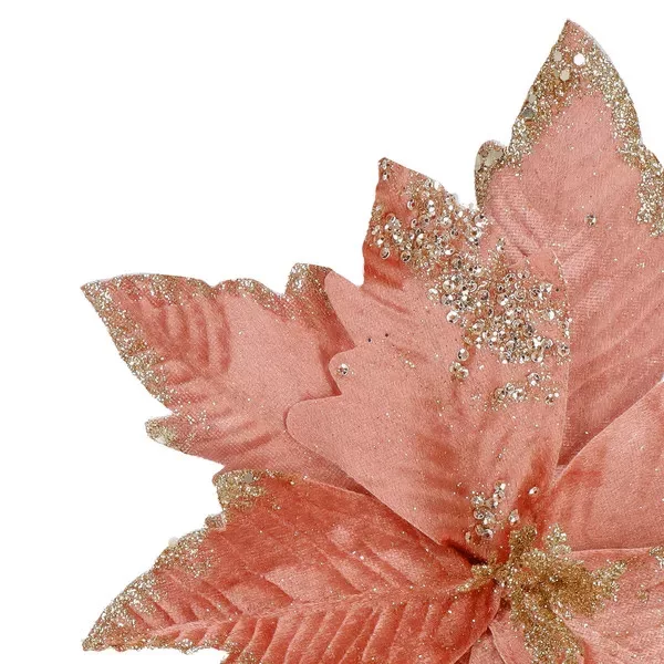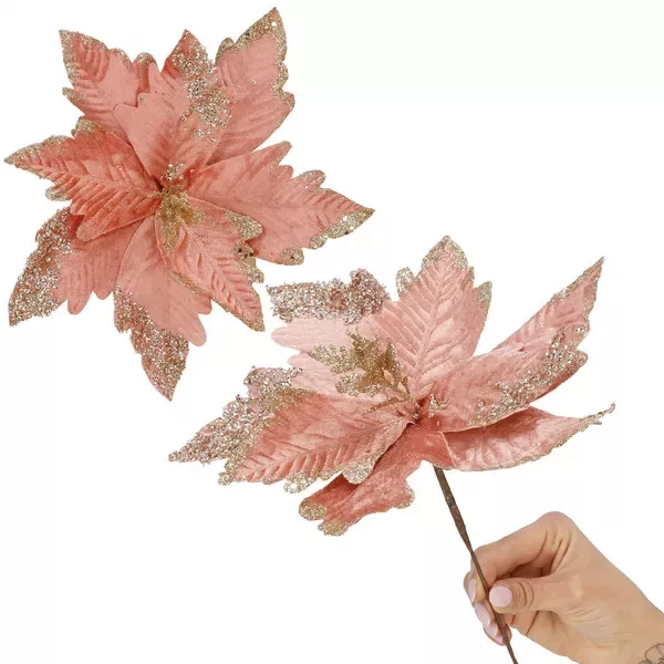 Dobd fel otthonod karácsonyi hangulatát ezzel a látványos, rózsaszín–arany mikulásvirág díszszel! A 29 cm-es átmérőjű, csillámos és flitteres levelek azonnal magukra vonzzák a tekintetet, legyen szó karácsonyfáról, adventi koszorúról vagy ünnepi asztaldíszről.