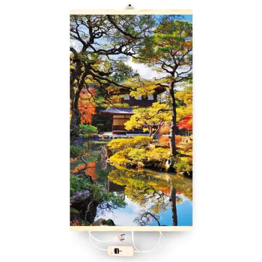 Valódi festményre emlékeztető, kertmintás, falra szerelhető infrapanel, amely 430 W teljesítményével kellemes, egyenletes meleget biztosít 10–12 m²-es helyiségekben. A karbonszálas fűtőfólia hosszú hullámú infravörös sugárzással nem a levegőt, hanem a tárgyakat és a testet melegíti, így komfortos hőérzetet ad és nem szárítja a levegőt.