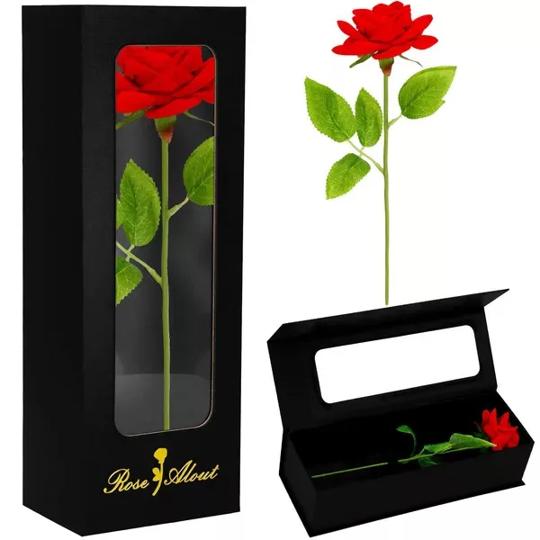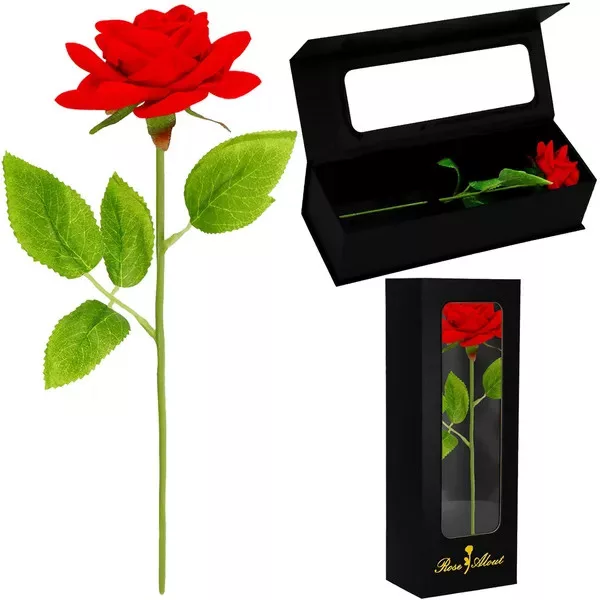 Az örök rózsa a romantika időtlen szimbóluma – nem hervad el, így évek múltán is ugyanolyan gyönyörű marad. A Springos® egyetlen, élénkvörös virágszálat helyezett fekete, mágneszárral zárható díszdobozba, amelynek átlátszó ablaka azonnal láttatni engedi az ajándék ékét.