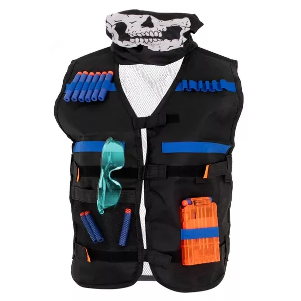 A kis lövöldözős kalandoroknak készült komplett taktikai mellény szett minden szükséges felszerelést tartalmaz, hogy a szivacslövedék-csaták még izgalmasabbak legyenek. A mellény könnyű, hátul hálós kialakítású, így nem melegszik túl, a tépőzáras pántok pedig egyszerű méretállítást tesznek lehetővé, ezért 6-12 éves gyerekekre egyaránt passzol. Az elülső zsebekben és rugalmas pántokban elférnek a lövedékek és a tár, a kék védőszemüveg pedig óvja a szemet. A koponyamintás bandana nemcsak vagány, de hűvös időben melegen is tart.