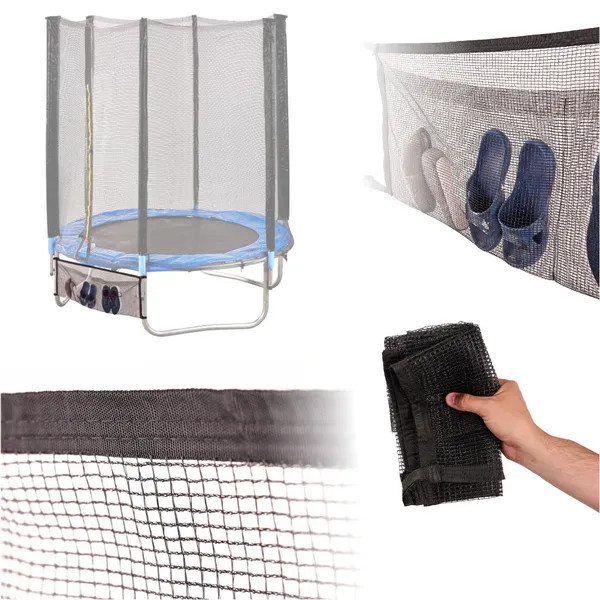 Megbízható segítség a rend fenntartásában a trambulin körül: a 110 × 46 cm-es, fekete poliészter háló 2 tágas zsebbel gondoskodik a cipők, kulcsok, telefonok és egyéb apróságok biztonságos tárolásáról ugrálás közben.