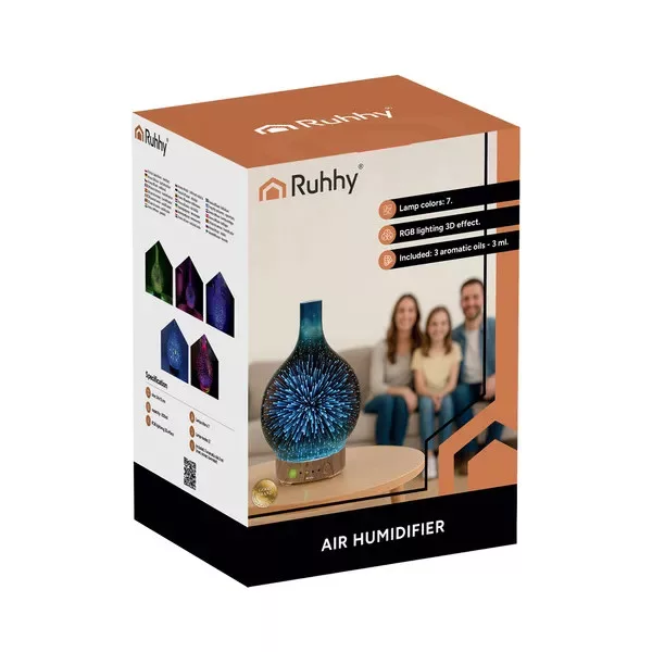 A doboz tartalma: Ruhhy aroma diffúzor, hálózati adapter, 3 × 10 ml illóolaj, használati útmutató, védőcsomagolás.