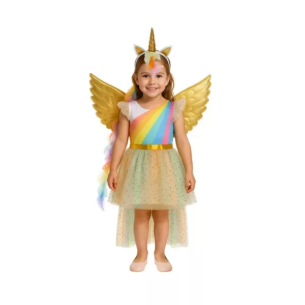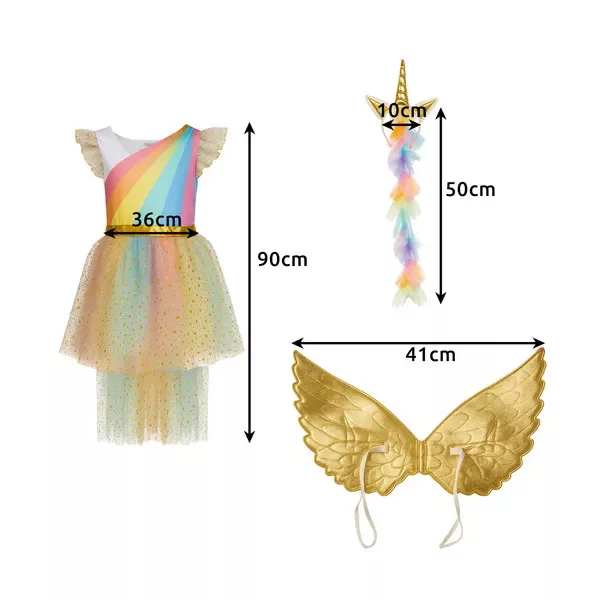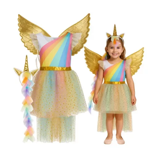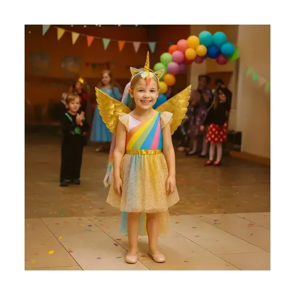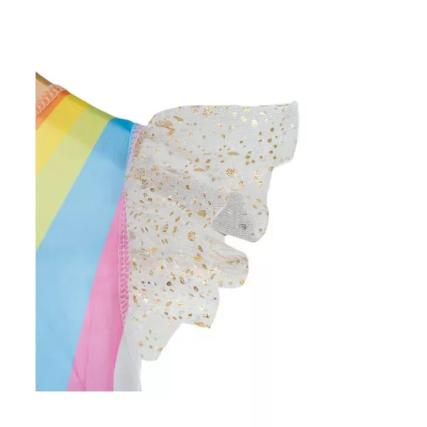 Engedd, hogy gyermeked belecsöppenjen a mesék világába ezzel a varázslatos, háromrészes unikornis jelmezzel! A szett egy csillogó, aranycsillagos tüllszoknyás ruhát, rugalmas pánttal rögzíthető szárnyakat és puha, szarvval díszített fejpántot tartalmaz, így nincs szükség külön kiegészítők beszerzésére.