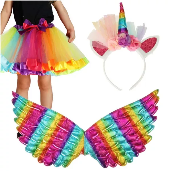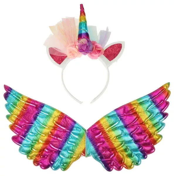 - A szett tartalma: tüll szoknya (30 cm), élénk szárnyak (42 × 22 cm) és puha fejpánt beépített unikornis szarvval.