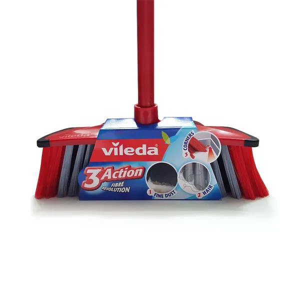 A Vileda 3Action seprű háromféle speciális sörtével gondoskodik a hatékony takarításról: a fekete sörte felszedi a hajszálakat és az állatszőrt, a szürke magába zárja a finom port, míg a két oldalon elhelyezett piros sörte a nehezen hozzáférhető sarkokból húzza ki a szennyeződést. A fej gumipereme óvja a falakat és a bútorokat a karcolásoktól.