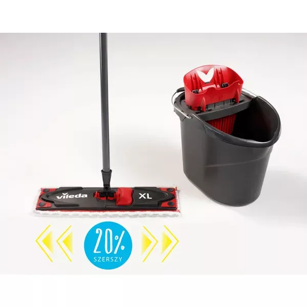 Ön is gyorsabb, higiénikusabb felmosásra vágyik? A Vileda Ultramax Turbo XL forgó lapos mop készletet kifejezetten nagy és kis alapterületű otthonokhoz tervezték. 42 cm széles, 20%-kal nagyobb mikroszálas felmosófeje egyszerre nagy sávot tisztít, miközben a vörös és fehér szálak kombinációja csíkmentes fényt és makacs szennyeződés-eltávolítást biztosít. A pedálos vödör centrifugája kíméli a kéz bőrét: a felmosó fej egyszerű beillesztésével és a pedál lenyomásával beállíthatja a kívánt nedvességszintet, anélkül hogy a vízhez érne.
