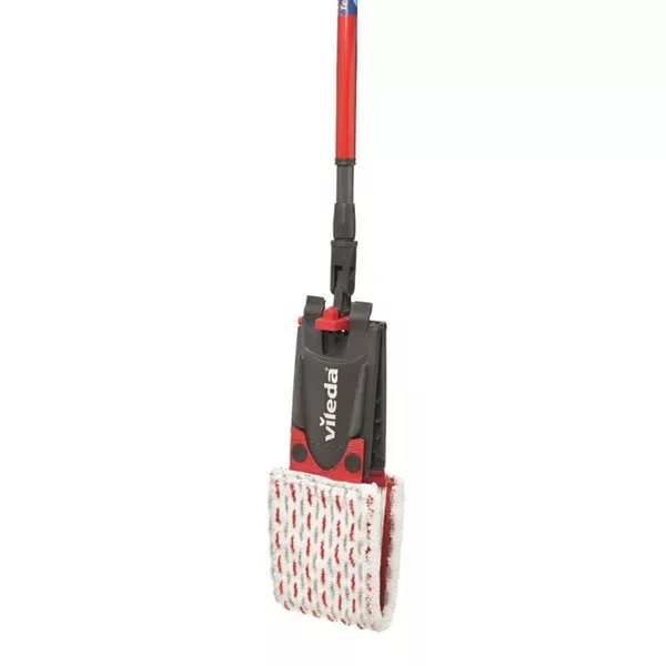 A Vileda Ultramax lapos mop teleszkópos nyéllel forradalmasítja a felmosást: az innovatív, érintésmentes csavarórendszernek köszönhetően a kezed mindig száraz marad, miközben hatékonyan távolítja el a koszt a parkettától a járólapig.