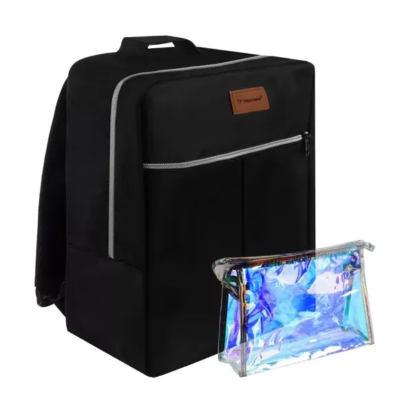 Praktikus, kézipoggyász méretű utazó hátizsák átlátszó kozmetikai táskával, amely megfelel a legtöbb légitársaság 40×20×25 cm körüli szabályának. 38×24×18 cm-es külső méretének és mindössze 500 g súlyának köszönhetően könnyű, mégis 17 literes pakolóteret kínál.