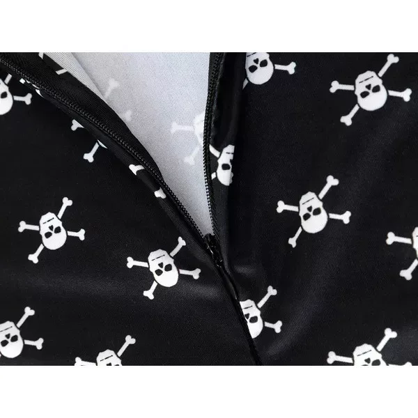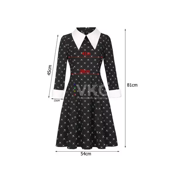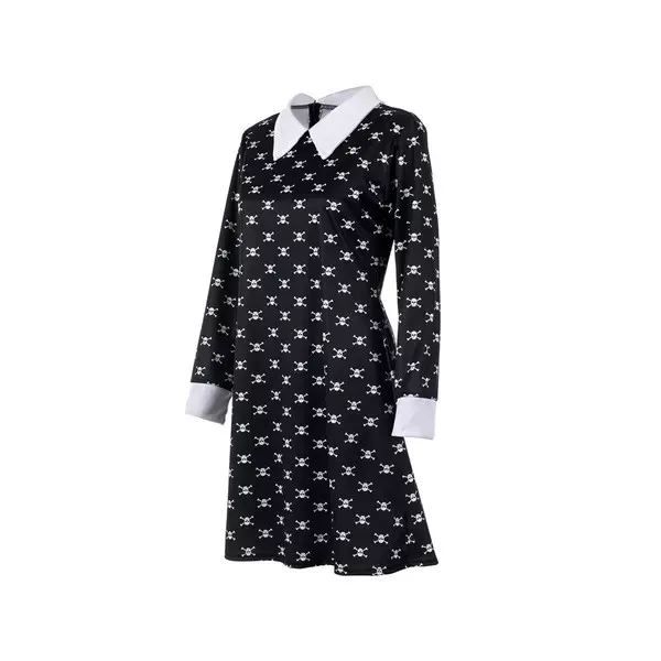 Varázsold valóra a sorozat ikonikus hangulatát ezzel a Wednesday Addams által ihletett fekete, koponyamintás gyerek ruhával, amely kifejezetten 125–135 cm közötti testmagasságra készült.