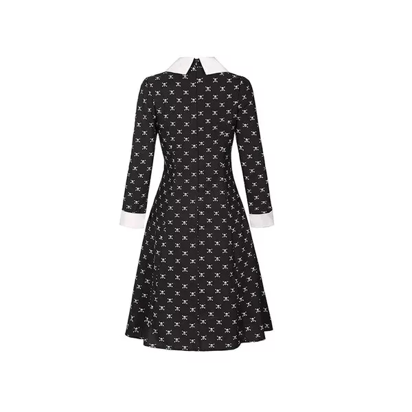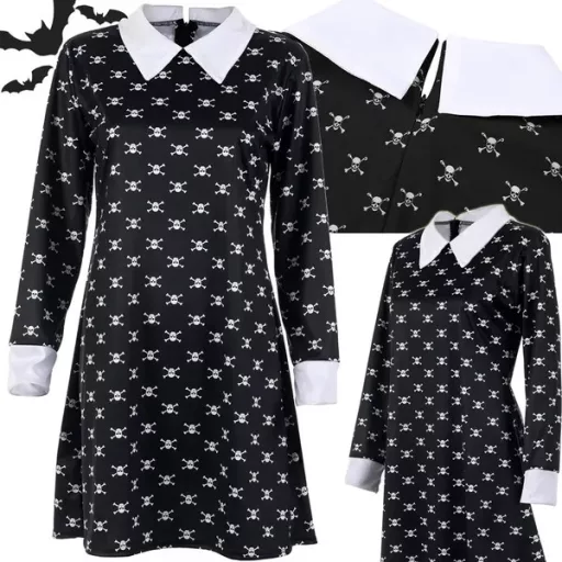 Keltsd életre a kultikus Wednesday Addams sötéten elegáns stílusát ezzel a fekete alapon fehér koponyamintás, hosszú ujjú gyerek jelmezzel. A széles, hófehér gallér és mandzsetta azonnal felismerhetővé teszi a karaktert, míg a rugalmas 100% poliészter anyag egész este kényelmes mozgást biztosít Halloween-partin, farsangon vagy bármilyen tematikus eseményen.